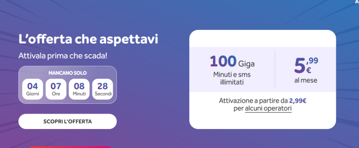 Scegliere l’offerta giusta per il proprio piano telefonico può essere complicato, con tariffe che spesso nascondono costi aggiuntivi o che aumentano nel tempo. Con ho. Mobile, però, la scelta diventa semplice: 100GB di traffico dati in 5G, minuti e SMS illimitati, tutto a soli 5,99 euro al mese.