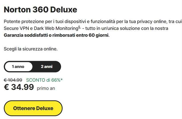 Norton 360 Deluxe è in offerta a 34,99€ su questa pagina. La promozione che prevede uno sconto del 66% resterà valida ancora per pochi giorni.