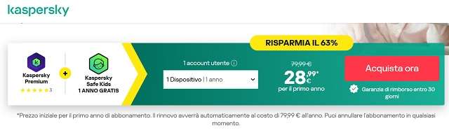 Kaspersky Premium in offerta speciale a 28,99 euro per il primo anno