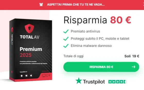 E poi c’èTotalAV Ultra Deal: antivirus, VPN e AdBlock per un intero anno, a soli 19€.Sì, proprio tutto incluso. Il prezzo originale è di 99€, e oggi hai quindi un risparmio netto di ben 80€: non puoi non approfitarne!