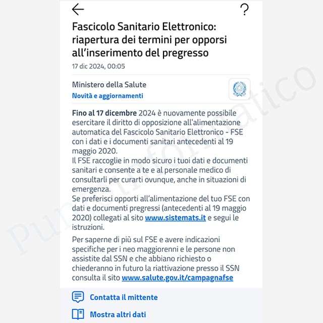 A inviarla è il Ministero della Salute e fa riferimento alla riapertura dei termini per opporsi all’inserimento del pregresso