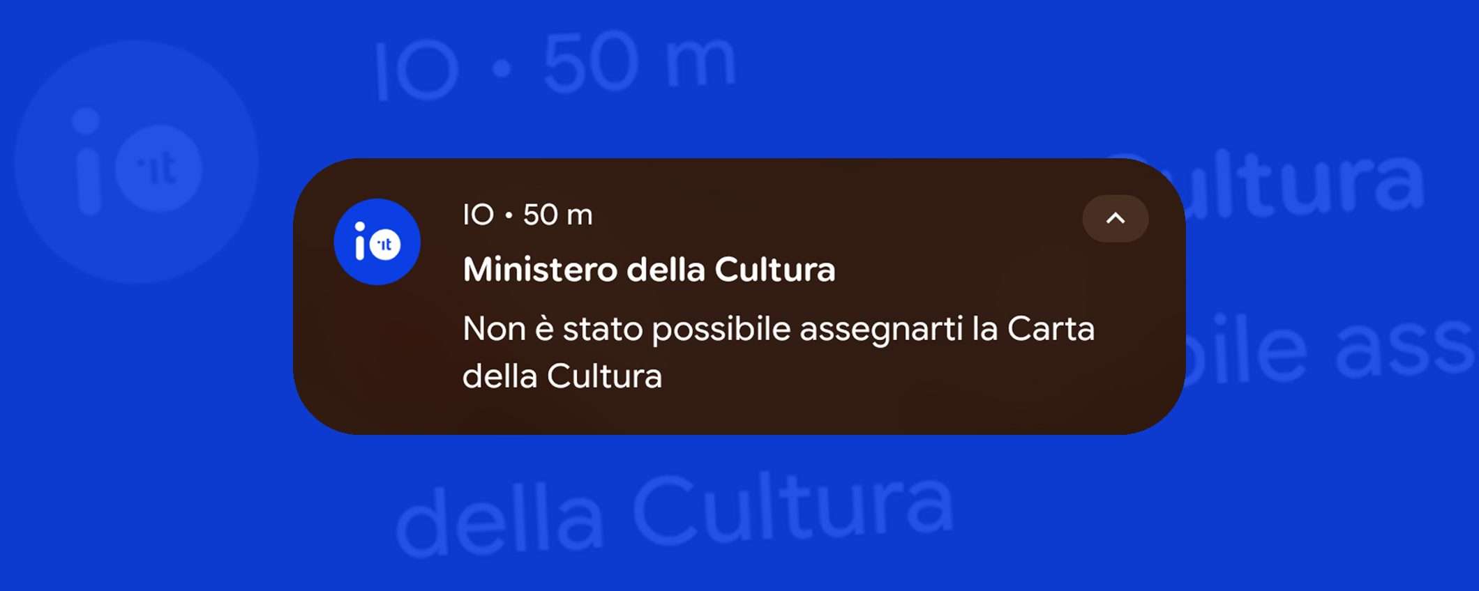 L’avviso si presenta sotto forma di una notifica come quella visibile qui. Proviene dal Ministero della Cultura, il dicastero che gestisce l’iniziativa. Come si può leggere, in questo caso il bonus non è stato assegnato (Non è stato possibile assegnarti la Carta delle Cultura