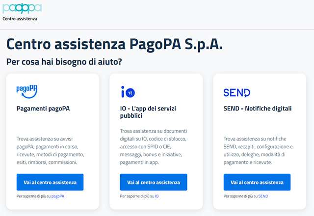PagoPA ha appena annunciato la pubblicazione del nuovo Centro assistenza dedicato alle sue piattaforme. Raggiungibile all’indirizzo centroassistenza.pagopa.it, è una risorsa online chiara, aggiornata e consultabile con facilità dedicata all’app IO, a pagoPA per i pagamenti verso la Pubblica Amministrazione e a SEND per le notifiche digitali.