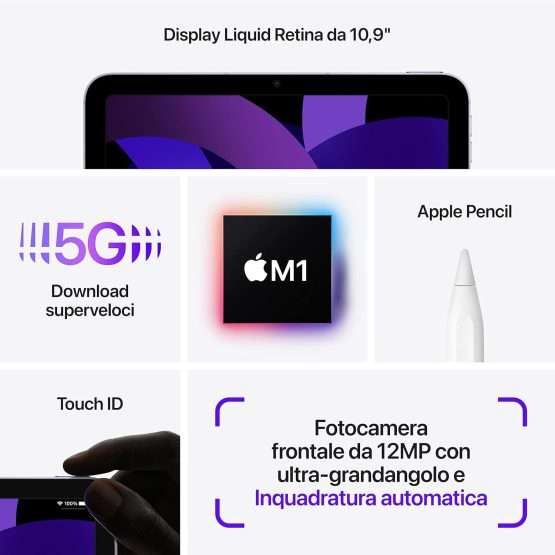 Apple 2022 iPad Air di 5ª generazione ti consente di avere un dispositivo che chiamarlo tablet è riduttivo. Potente, formidabile e capace di essere un compagno per tutte le tue azioni quotidiane. Comodo e pratico per lavoro, studio e svago così da non rinunciare a niente. Con le sue linee eleganti e il suo spesso minimo, infilarlo in borsa o nello zaino è all’ordine del giorno.