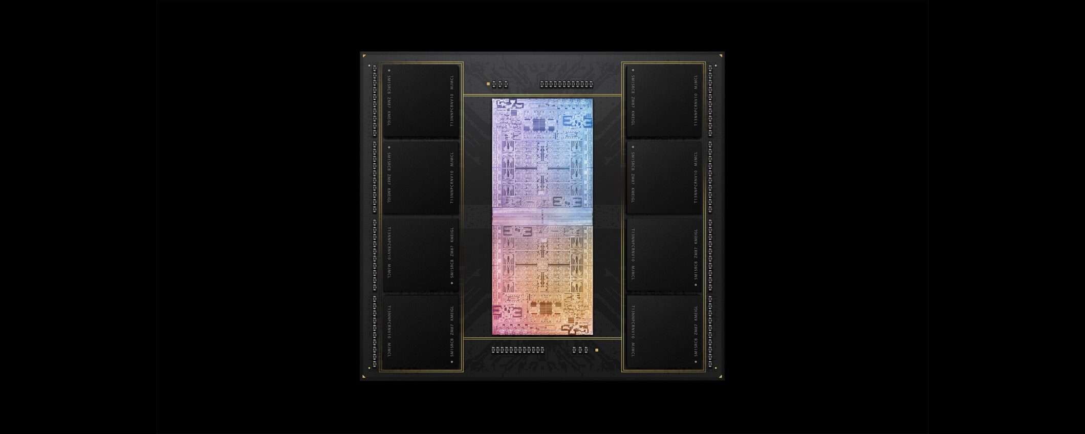 M1 Ultra offre 32 canali di memoria LPDDR5 e una larghezza di banda di 800 GB/s. Sul package, ai lati del SoC, sono saldati 8 chip LPDDR5 per un totale di 128 GB. Il SoC integra inoltre il Neural Engine a 32 core e soprattutto una GPU a 64 core. Secondo Apple, la GPU offre prestazioni superiori a quella della GPU desktop più potente sul mercato, ovvero la NVIDIA GeForce RTX 3090, consumando 200 Watt in meno.
