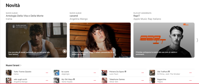 Su Apple Music c’è di tutto: grandi classici, interi dischi, ultime hit e oltre 30mila playlist tematiche curate dalla redazione. A proposito delle novità recenti, ce ne sono alcune davvero notevoli. Due nomi su tutti? I nuovi dischi di Irama e Angelina Mango, intitolati rispettivamente “Antologia della Vita e della Morte” e “Caramè”.
