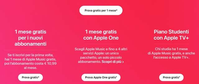 Tornando infine alla prova gratuita, al termine l’abbonamento ad Apple Music si rinnova al prezzo di 10,99 euro al mese. Sono poi disponibili altri due piani: Studenti a 5,99 euro al mese e Famiglia a 16,99 euro al mese.
