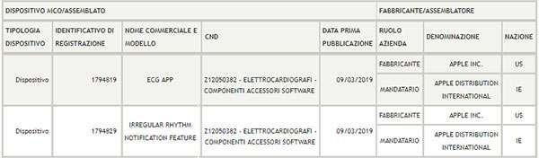 Per l’Italia il placet è arrivato solo ora. Lo conferma il sito del Ministero della Salute, che nell’elenco dei dispositivi medici ne include due attribuiti ad Apple Inc, classificati come “Elettrocardiografi – Componenti accessori software”. Sono identificati dai codici “1794819” e “1794829” nonché dai nomi commerciali “ECG App” e “Irregular Rhythm Notification Feature”. Non leggiamo alcun riferimento specifico ad Apple Watch, ma la data di attribuzione (09/03/2019) lascia pochi dubbi sul fatto che si tratti dell’orologio di Cupertino e della sua componente software.
