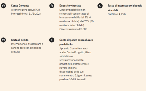 Come accennato, Conto Key è abbinato a Conto Progetto, un conto deposito flessibile che ti permette di guadagnare interessi sui tuoi risparmi. Conto Progetto non ha una durata predefinita, quindi puoi riavere le tue somme quando vuoi, senza perdere gli interessi maturati. Questo conto deposito offre una serie di opzioni di investimento, con tassi di interesse che variano in base alla durata del vincolo. La giacenza minima per aprire un conto deposito è di 5.000 euro. Se ad esempio desideri vincolare questa somma per 6 mesi, otterrai un interesse lordo del 3,75%, che corrisponde a un rendimento netto di 2,78%. Se invece hai intenzione di vincolarla per il periodo massimo consentivo, ovvero 60 mesi, otterrai un interesse lordo del 4,75%, che corrisponde a un rendimento netto di 3,52%. Puoi anche scegliere la soluzione svincolabile, ma in quel caso i tassi di interesse lordi varieranno dal 3% al 4,50%.