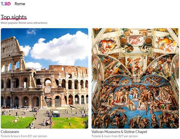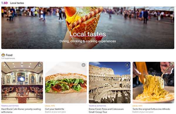 Selezionando una città si apre una pagina che illustra come trascorrere il proprio tempo, tra arte, cultura, luoghi da visitare e buona cucina. Le informazioni sono raccolte all’interno di varie sezioni: Top Sights (le migliori attrazioni), Tours & Activities, Local Tips (suggerimenti dai viaggiatori più esperti) e Free Tours. Nella parte superiore alcuni pulsanti utili per specificare la data del viaggio e filtri di ricerca attraverso i quali indicare quanto si desidera spendere. Particolarmente interessante la possibilità di elencare solo i tour che prevedono un rimborso parziale o completo delle prenotazioni.