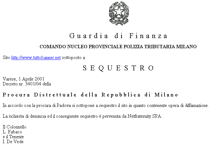 Il primo aprile, chiunque si fosse recato su Tuttobanner.net, o sul sito di ngi.it e alcuni altri siti italiani, avrebbe trovato un falso “disclaimer” della Guardia di Finanza che annunciava il sequestro del sito su denuncia di Netfraternity, azienda più volte tirata in ballo nelle discussioni su quel forum. Un fake che, come si può notare dall’immagine pubblicata a lato, risultava immediatamente evidente. Un falso ispirato, con ogni probabilità, alla vicenda Bismark di cui su queste pagine si è parlato.