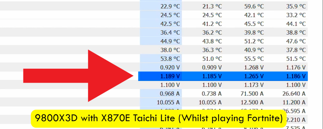 Approfondendo, il canale YouTube ha notato che le schede madri ASRock, come la X870E Taichi Lite con Ryzen 9800X3D, mostrano fluttuazioni continue nella tensione SoC, a differenza di altre schede madri che mantengono valori stabili intorno a un valore di 1,20V. Nel caso delle schede madri prodotte dalla sussidiaria ASUS, la tensione può superare 1,250V, arrivando vicino a 1,270V, un livello superiore al massimo valore consigliato. Solo ASUS X870E Crosshair Hero si discosta leggermente, aggiungendo 50 mV per maggior stabilità, ma senza alcuna fluttuazione.
