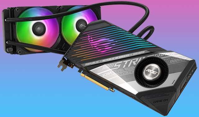 Le ROG Strix LC Radeon RX 6950 XT impiegano sistemi di raffreddamento a liquido con una piastra che copre integralmente tutti i componenti, lavorando insieme a un radiatore da 240 mm. C’è anche un dissipatore a basso profilo che riduce l’ingombro.