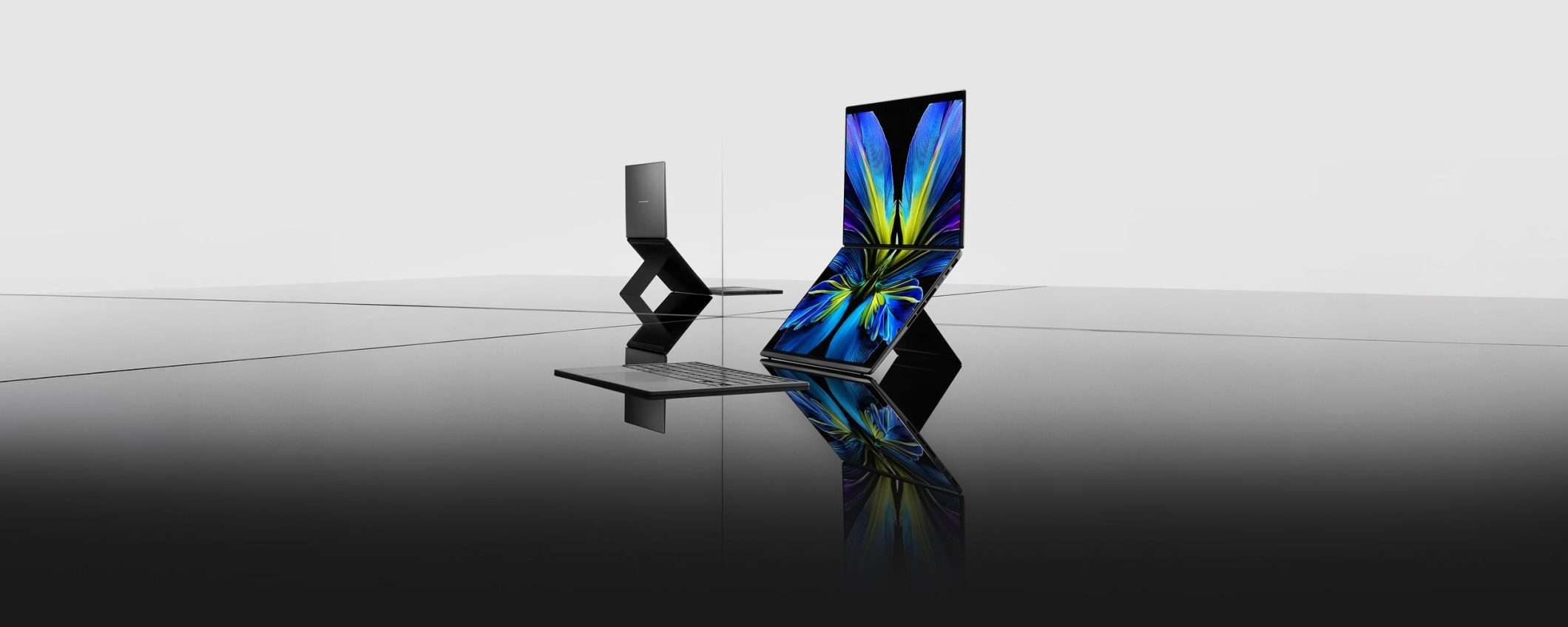 Nella parte posteriore del display inferiore è presente un cavalletto. Gli utenti possono utilizzare anche la tastiera Bluetooth rimovibile con contatti magnetici (pogo pin). In Italia sono disponibili due configurazioni con processori Intel Core Ultra 7 355 o Core Ultra X9 388H, 16 o 32 GB di RAM LPDDR5X e SSD PCIe 4.0 da 1 o 2 TB.