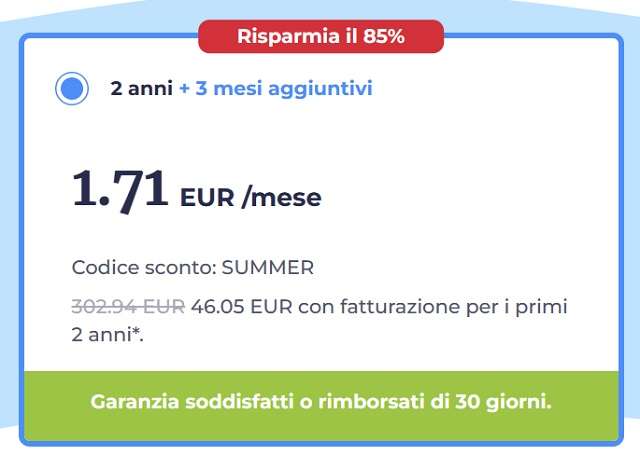 Cogli al volo l’opportunità di attivare Atlas VPN a soli 1,71 euro al mese per 2 anni, risparmiando oltre 250 euro sul prezzo di listino.