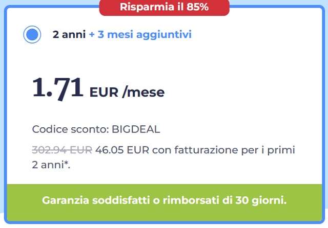Per i primi 2 anni paghi dunque appena 46,05 euro, in più benefici di 3 mesi aggiuntivi in regalo. Tutto questo con la garanzia soddisfatti o rimborsati in 30 giorni: ciò significa che se le prestazioni della VPN non si rivelano all’altezza delle tue aspettative iniziali, puoi decidere di avvalerti del rimborso completo entro 30 giorni dall’acquisto.