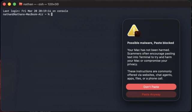 Come confermato recentemente dagli esperti di Malwarebytes, gli attacchi ClickFix contro gli utenti Mac sono in aumento. È una tecnica semplice ed efficace che consente di aggirare le protezioni del sistema operativo. Apple ha deciso di avvisare del pericolo quando viene copiato un comando nel terminale.
