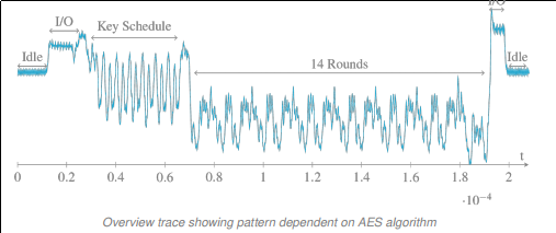 Nel campionamento effettuato è stato possibile individuare vari pattern ricollegabili al consumo energetico istantaneo (strettamente legato alla mole e alla tipologia di dato che il processore sta trattando), raffiguranti le fasi di scambio di dati con l’esterno (input/output), gestione della chiave (key schedule), e i 14 rounds della fase di encryption.