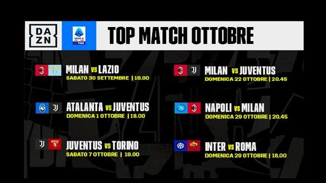Sabato 7 ottobre spazio invece alle emozioni del derby della Mole Juventus-Torino, mentre domenica 22 ottobre tutti i riflettori saranno accesi sul big match di San Siro Milan-Juve. A fine ottobre arriva il gran finale con le maxi sfide Napoli-Milan e Inter-Roma, entrambe in calendario domenica 29 ottobre.