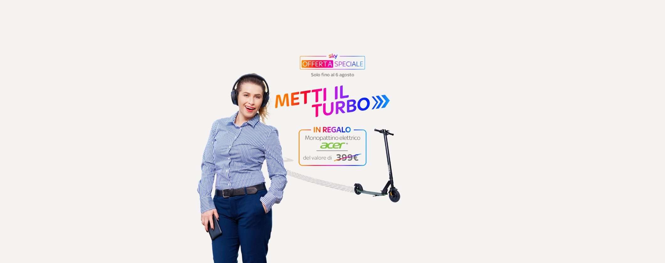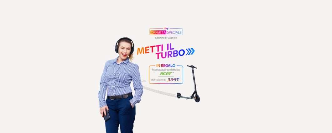 Entra subito in Sky a soli 30,90 euro, anziché 45 euro al mese. Questa promozione rimane attiva per 18 mesi. Scegliendo questa offerta speciale riceverai in regalo un Monopattino Elettrico Acer del valore di 399 euro. Fantastico vero? Allora non perdere tempo. La promozione ti permette di avere accesso a tutto l’intrattenimento dei pacchetti TV e Sport.