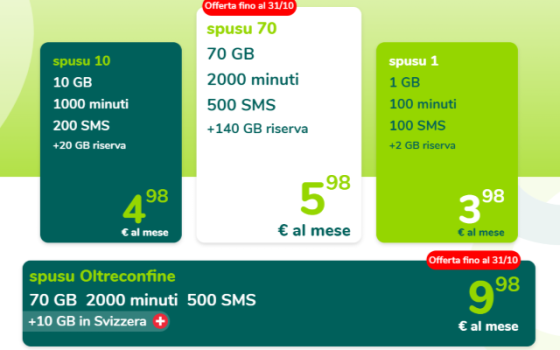 Se non hai bisogno di molti dati internet, puoi approfittare delle altre offerte dell’operatore. Ad esempio, Spusu 1 ti offre 1 GB di dati, 100 minuti di chiamate, 100 SMS e fino a 2 GB di riserva. L’offerta è disponibile al prezzo di 3,98 euro al mese. Spusu 10 ti propone 10 GB di connessione dati, 1000 minuti, 200 SMS gratuiti e fino a 20 GB di riserva. Se per lavoro o per piacere viaggi spesso in Svizzera, puoi approfittare di un’altra geniale promozione dell’operatore. Spusu Oltreconfine, ti concede tutti i vantaggi dell’offerta precedente, ma aggiunge anche altri 10 GB da utilizzare in Svizzera. Come la precedente, anche questa è disponibile fino al 31 ottobre 2023. Naturalmente, se hai bisogno di più GB, puoi optare per il piano SpusuOltreconfine+. Al prezzo di 14,98 al mese, potrai sfruttare fino a 30 GB durante i tuoi viaggi in Svizzera.