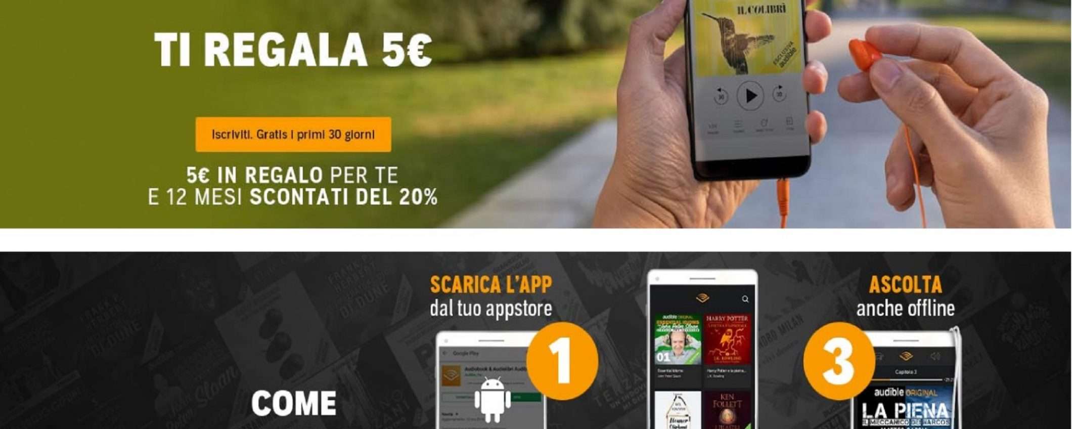 Audiolibri: Amazon Audible in offerta a 7,99 euro al mese con in regalo 5 euro di buono sconto