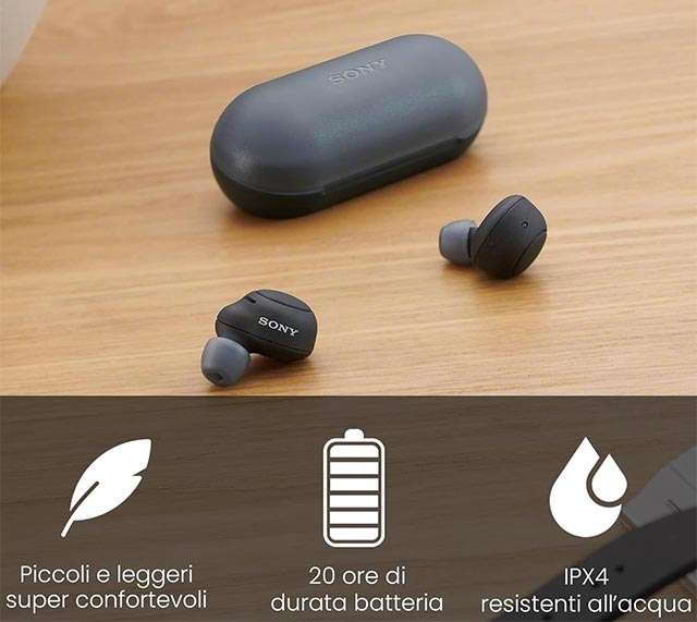 Tra i punti di forza vala la pena citare il design ergonomico studiato per il massimo del comfort, le 24 ore di autonomia garantite dalla custodia che svolge anche il ruolo di base per la ricarica, la presenza della certificazione IPX4 per assicurare la resistenza al sudore, la tecnologia DSEE (Digital Sound Enhancement Engine) e una connettività Bluetooth sempre stabile. Sulla parte esterna trovano posto pulsanti touch per controllare la riproduzione della musica, regolare il volume, rispondere alle chiamate e interagire con l’assistente vocale. Tutti gli altri dettagli sono riportati nella scheda del prodotto.