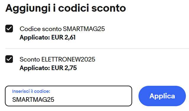Per acquistare Skullcandy S2FYW al prezzo finale di soli 49,63 euro devi solo applicare i seguenti codici sconto nell’apposito campo, prima di effettuare il pagamento: SMARTMAG25 ed ELETTRONEW2025. L’immagine qui sotto ti mostra come fare, è semplice e veloce.