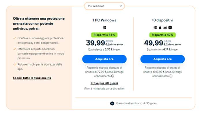Tutte funzionalità che puoi avere praticamente a metà prezzo con lo sconto del 47% per tutto il primo anno di utilizzo, fino a 10 device. Un’offerta assolutamente da non perdere, che ti garantisce una protezione informatica ad appena 4.17€ al mese.