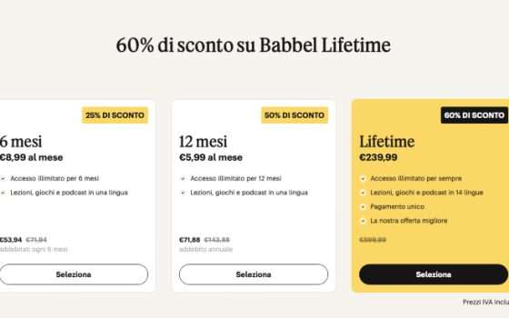 Le diverse attività motivanti ti consentono dunque di imparare la lingua che preferisci come se fossi in una tradizionale aula. Oggi puoi fare tutto ciò approfittando di una speciale promozione che ti consente di risparmiare sul costo iniziale dell’abbonamento. Tra i piani disponibili, ad esempio, il piano Lifetime è il preferito dagli utenti perché ottieni l’accesso illimitato per sempre. Grazie al -60%, oggi costa solamente 239,99 euro!