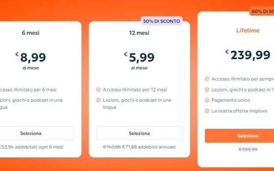 - Abbonamento Lifetime con il 60% di Sconto: Un pagamento unico di €239,99 per un accesso a vita a lezioni, giochi e podcast in 14 lingue con una riduzione dal prezzo originale di €599,99.