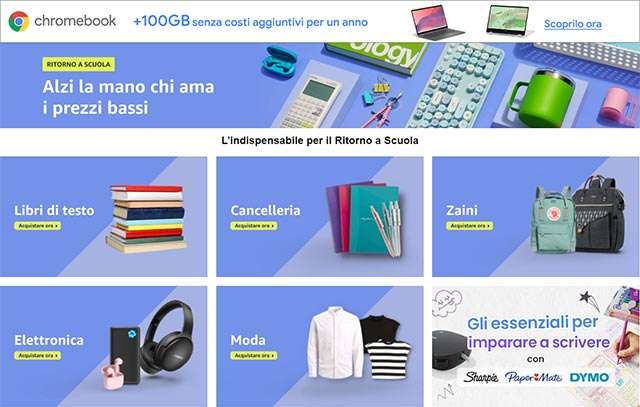C’è anche una sezione che si concentra sulla categoria Elettronica raccogliendo tutto ciò che serve per studiare, anche a casa. L’ultima che segnaliamo è quella degli essenziali per imparare a scrivere con i prodotti dei marchi Sharpie, Paper Mate e Dymo.