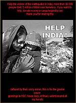 Sulla home page modificata del sito, campeggiava una unica immagine su sfondo nero, qui riprodotta in scala, nella quale era scritto un appello, “Help India”, e l’indicazione di un sito, www.helpindia.com, studiato per consentire donazioni e aiuti internazionali al paese e oggi frequentato in relazione al disastroso terremoto che si è scatenato di recente nella zona più ricca del paese asiatico.
