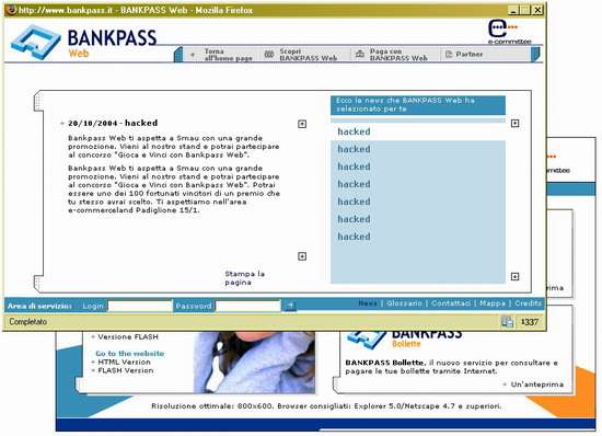 Scrive B.J.B. a Punto Informatico : “Salve, stamattina mi ero convinto di iscrivermi al sito BankPass, per poter gestire in modo sicuro i pagamenti. Navigando però sul sito alla ricerca di informazioni ho visto che nella home page http://www.bankpass.it/html/index.asp compare la parola “hacked” come titolo di tutte le news. Ovviamente ho rinunciato dall’iscrivermi ad un sito così sicuro.”