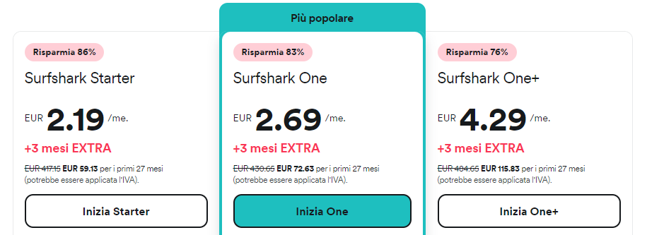 Non solo il piano base gode di sconti esorbitanti, ma anche SurfShark One e SurfShark One+ sono in saldo, rispettivamente con sconti dell’83% e del 76%. Pure i piani annuali offrono sconti attorno all’80%. Quindi, se siete interessati, potreste ottenere una delle migliori VPN sul mercato per soli 2,19€ al mese.