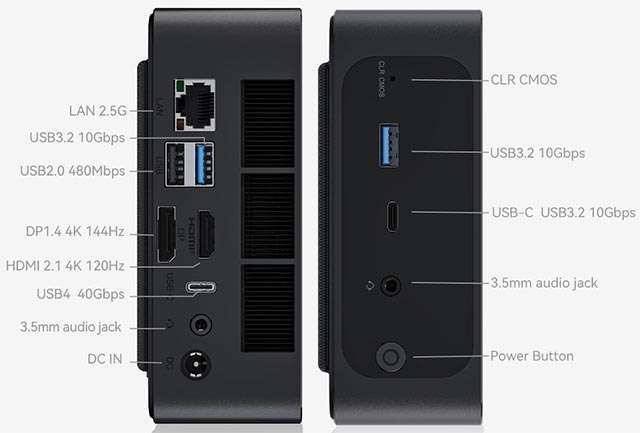 Nonostante le dimensioni compatte del case, offre un gran numero di porte fisiche per le connessioni di periferiche, accessori e unità esterne. Ecco quelle segnalate nella pagina dedicata sull’e-commerce: due USB 3.2 Type-A, una USB 2.0 Type-A, una USB-C 3.2, una USB-C 4 con output video, uscite HDMI 2.1 e DisplayPort 1.4 con supporto alla risoluzione 4K, slot Ethernet 2.5G e due jack audio.