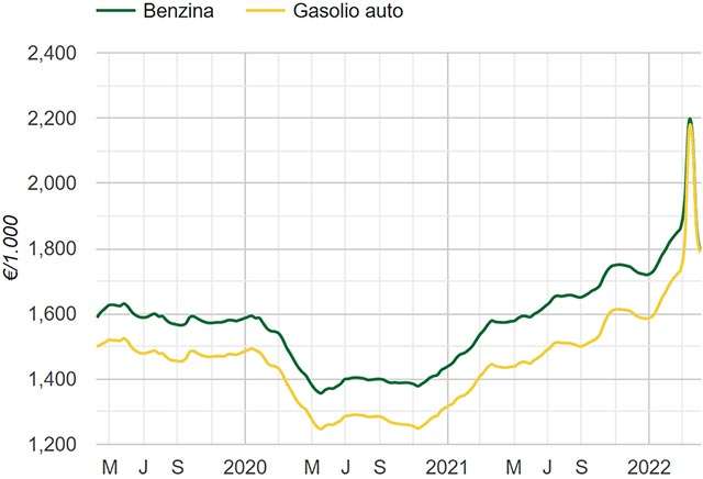 Nell’immagine qui sotto, l’andamento dei prezzi di benzina e gasolio nel tempo. Fanno riferimento a una media nazionale elaborata ogni settimana.