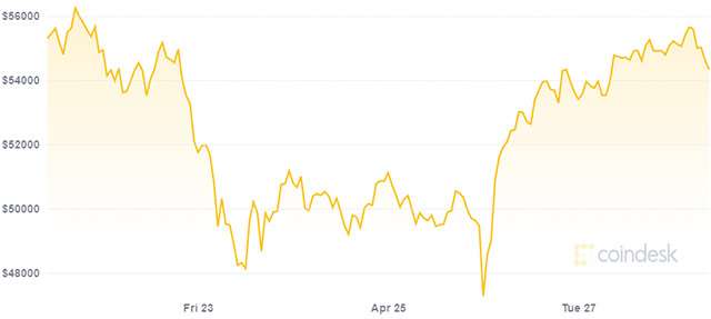 Il grafico qui sopra mostra la variazione nel valore di Bitcoin registrata nel corso dell’ultima settimana (fonte CoinDesk). La criptovaluta è passata dai 56.252 dollari del 21 aprile ai 47.272 dollari di tre giorni più tardi. Nel momento in cui viene scritto e pubblicato questo articolo si attesta a 54.417 dollari, in conseguenza a un nuovo trend di crescita innescato dopo giorni di ribasso. Il record storico risale al 14 aprile: 64.829 dollari.