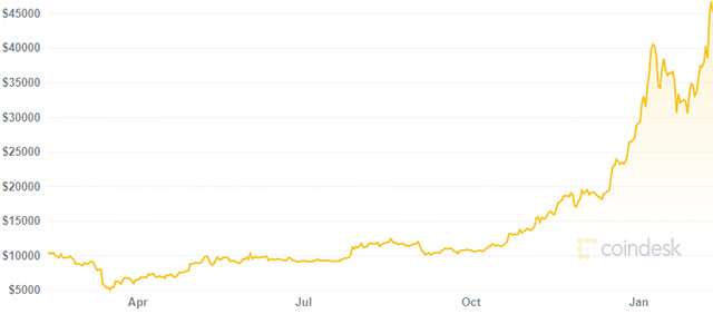 È sufficiente dare uno sguardo al grafico di seguito per capire l’entità dell’impennata apprezzata nel corso dell’ultima settimana. Cosa l’ha innescata? Tra gli altri fattori c’è senza dubbio anche l’investimento da 1,5 miliardi di dollari da parte di Tesla (una mossa che ha fatto storcere il naso in quando a sostenibilità) che ha nuovamente puntato un faro su Bitcoin accelerandone le transazioni.