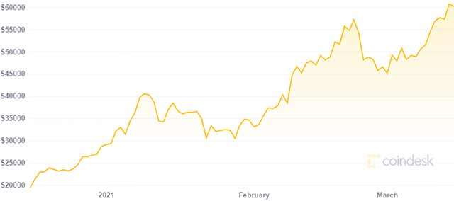 Come ultima immagine quella che raffigura l’intero ultimo anno durante il quale la criptovaluta è passata da meno di 5.000 dollari agli attuali circa 60.000.