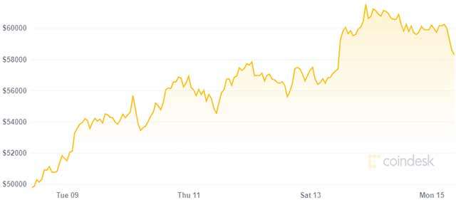 Altro weekend al rialzo quello di Bitcoin: il valore della moneta è stato spinto nuovamente verso l’altro, arrivando a far registrare l’ennesimo record oltre la soglia dei 61.500 dollari, raggiungendo per l’esattezza 61.556,59 dollari. Nel momento in cui viene scritto e pubblicato questo articolo si attesta a 58.186,69 dollari.