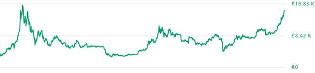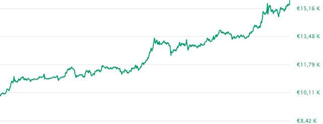 Non si arresta la crescita del valore di Bitcoin. Nel momento in cui viene scritto e pubblicato questo articolo 1 BTC = 15.679 euro. Per capire l’entità del balzo verso l’alto è sufficiente pensare che un mese fa (il 20 ottobre) si aggirava intorno ai 10.000 euro. Molti danno ormai per scontato il sorpasso imminente del record storico risalente al dicembre 2017 quando toccò i 16.805 euro.
