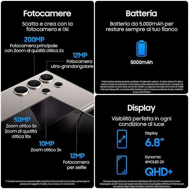 Ha in dotazione un display QHD+ da 6,8 pollici con pannello Dynamic AMOLED 2X, una fotocamera posteriore principale da 200 megapixel e una batteria da 5.000 mAh con autonomia elevata. Il processore è uno Snapdragon 8 Gen 3 di Qualcomm. Non manca il supporto nativo all’intelligenza artificiale della suite Galaxy AI per operazioni come le traduzioni in tempo reale, la ricerca dei contenuti, la creazione rapida delle note, la correzione delle immaginoi e molto altro ancora. Per l’elenco completo delle specifiche tecniche e delle funzionalità integrate, dai uno sguardo alla scheda completa.