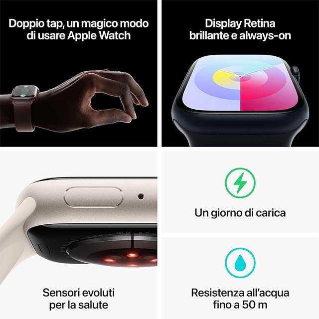 Con display Retina always-on e autonomia che arriva a un giorno intero con una sola carica della batteria, può contare sul supporto a funzionalità avanzate come il doppio tap per interagire con le applicazioni e con i contenuti multimediali. Non mancano ovviamente il monitoraggio avanzato e preciso per i parametri biometrici e per l’attività fisica. Trovi tutte le altre informazioni che cerchi nella pagina della promozione.