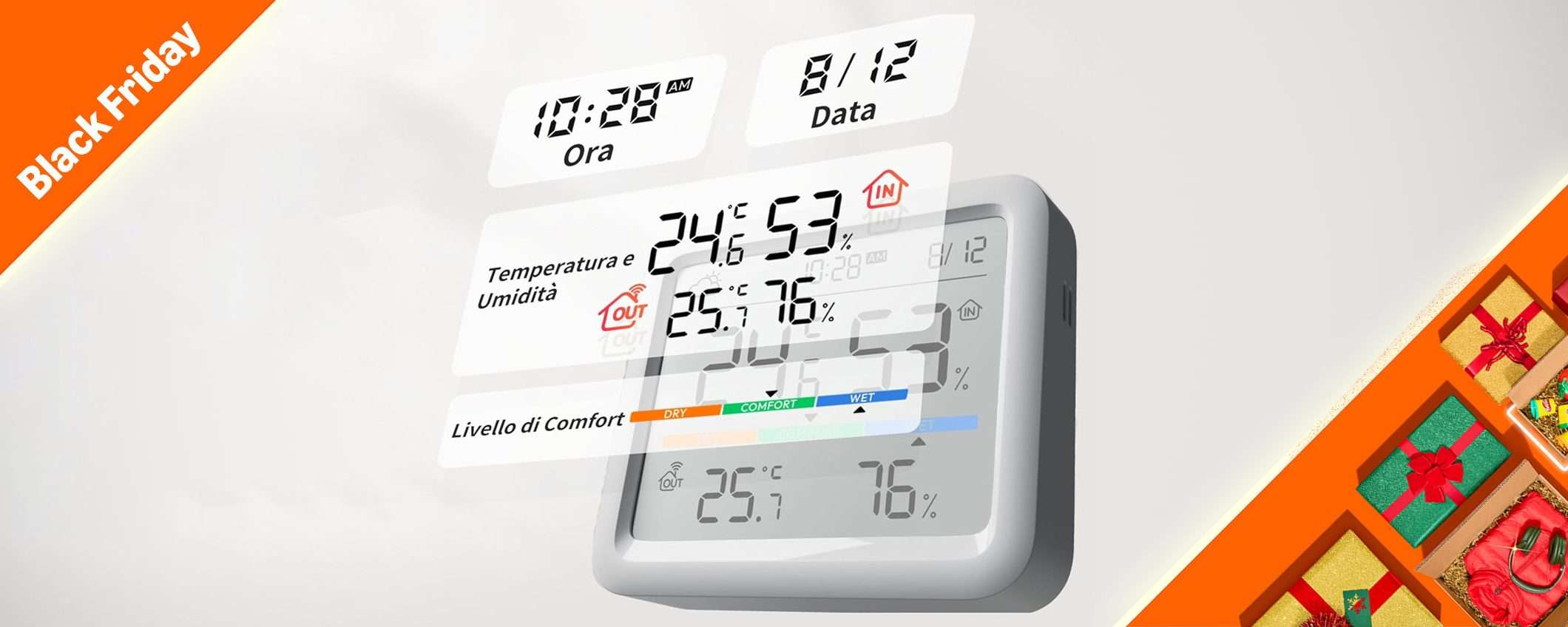È un dispositivo 5-in-1 con display da 3,6 pollici che visualizza temperatura, umidità, ora, data, livello di comfort e previsioni del tempo (quest’ultimo se associato a uno hub). Fornisce tutte le informazioni essenziali sull’ambiente domestico e può contare sulla certificazione IP65 per quanto riguarda l’impermeabilità. Può essere installata anche all’esterno e non teme la pioggia. Il design è compatto ed elegante con supporti per appenderlo a parete e regolabili per una facile collocazione in qualsiasi stanza. Inoltre è a basso consumo energetico con una durata delle batterie (due di tipo AA, incluse nella confezione) pari a 12 mesi e promemoria per la sostituzione. Nella descrizione trovi altri dettagli.