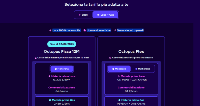 Con l’offerta Octopus Fissa 12M, i nuovi clienti possono fissare il prezzo dell’energia a 0,1298 €/kWh per la luce e 0,489 €/Smc per il gas naturale, per un periodo di 12 mesi. A questo si aggiunge un costo di commercializzazione estremamente competitivo, pari a 7€ al mese, tra i più bassi sul mercato. In più, l’energia fornita è 100% rinnovabile, a testimonianza dell’impegno di Octopus Energy nella sostenibilità.