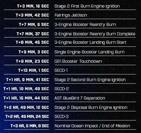 Il lancio è avvenuto alle ore 7:25 (le 13:25 in Italia). Dopo la separazione tra i due stadi del razzo, quello inferiore è atterrato senza problemi sulla nave drone nell’Oceano Atlantico. Lo stadio superiore doveva quindi portare in orbita il satellite BlueBird 7 di AST SpaceMobile. A causa di un’anomalia, il rilascio è avvenuto ad un altitudine di circa 150 Km, invece dei circa 460 Km previsti. Dato che il propulsore non può portare il satellite nell’orbita corretta, AST SpaceMobile ha comunicato che verrà distrutto con il rientro nell’atmosfera.