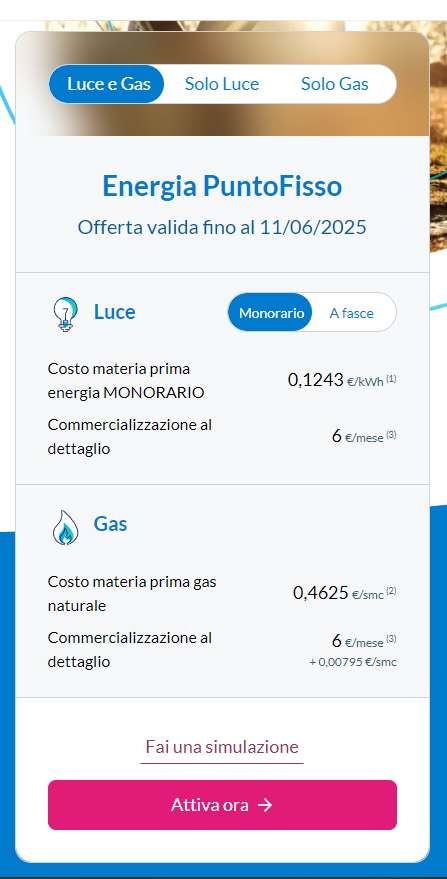 Per quanto riguarda l’energia elettrica, il costo della materia prima è pari a 0,1243 €/kWh, a cui si aggiunge un canone mensile di 6 euro per la commercializzazione al dettaglio. Per il gas naturale, il costo della materia prima è di 0,4625 €/Smc, con un canone mensile di 6 euro e un supplemento di 0,00795 €/Smc.