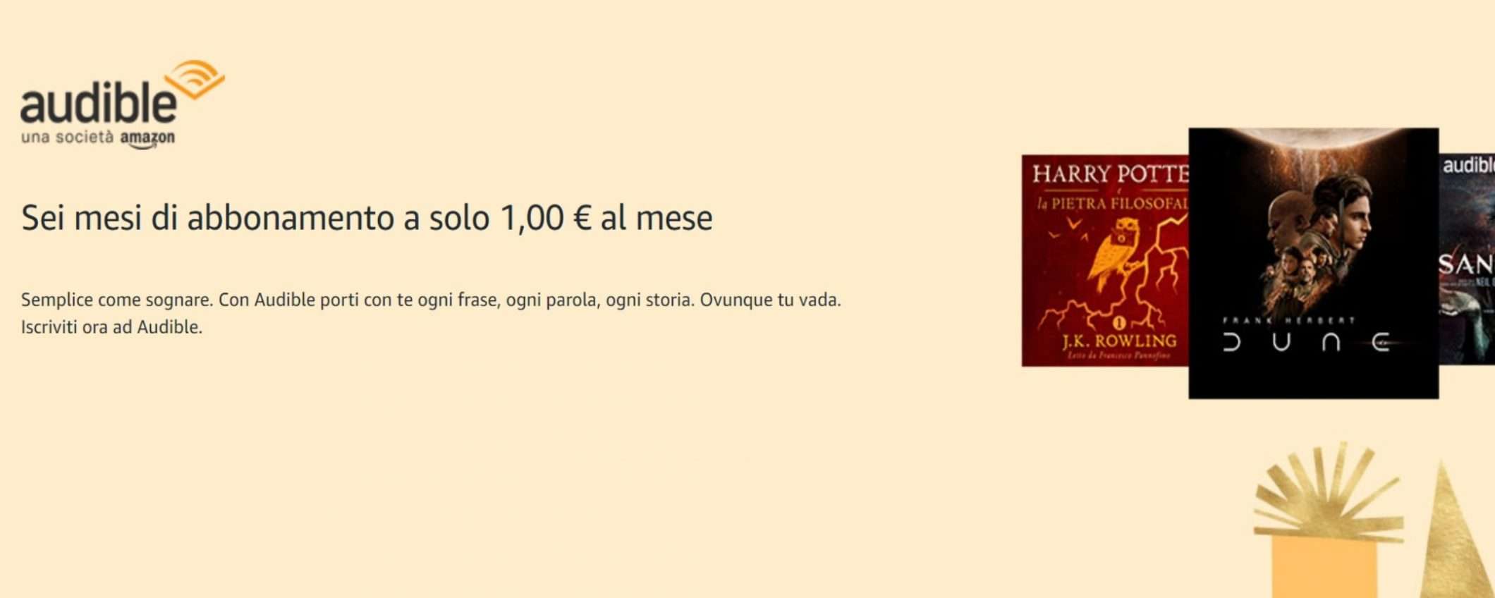 Grazie alla promozione lanciata da Amazon in occasione del Black Friday in anticipo, l’abbonamento ad audiblepuò essere sottoscritto a solo un 1 euro al mese per i primi 6 mesi.