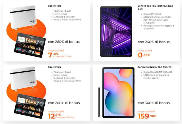 Permette di ottenere un accesso Internet a 1 Giga con modem incluso, senza costi di attivazione e con un anno di abbonamento alla piattaforma Amazon Prime. I dispositivi proposti sono Lenovo Tab M10 FHD Plus di seconda generazione e il Samsung Galaxy Tab S6 Lite, con le modalità riportate nell’immagine qui sotto.
